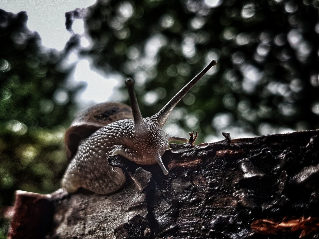 Een rustig buitje en overal kwamen de slakken tevoorschijn! Zo ook deze flinke jongen op een stam in onze voortuin