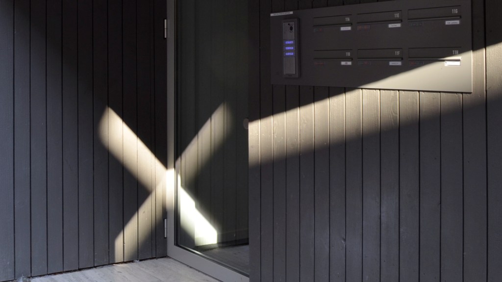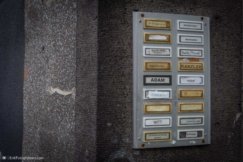 Naamplaatjes bij een flat in Keulen, sommige vergeeld en sommige verbleekt…