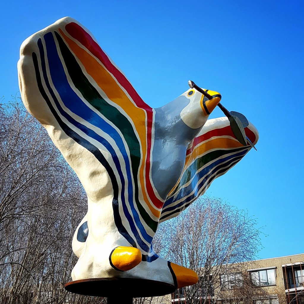 Deze vredesduif in alle kleuren van de regenboog staat in de wijk Hoge Vught in Breda. Geplaatst in 2010, gerenoveerd in 2021.