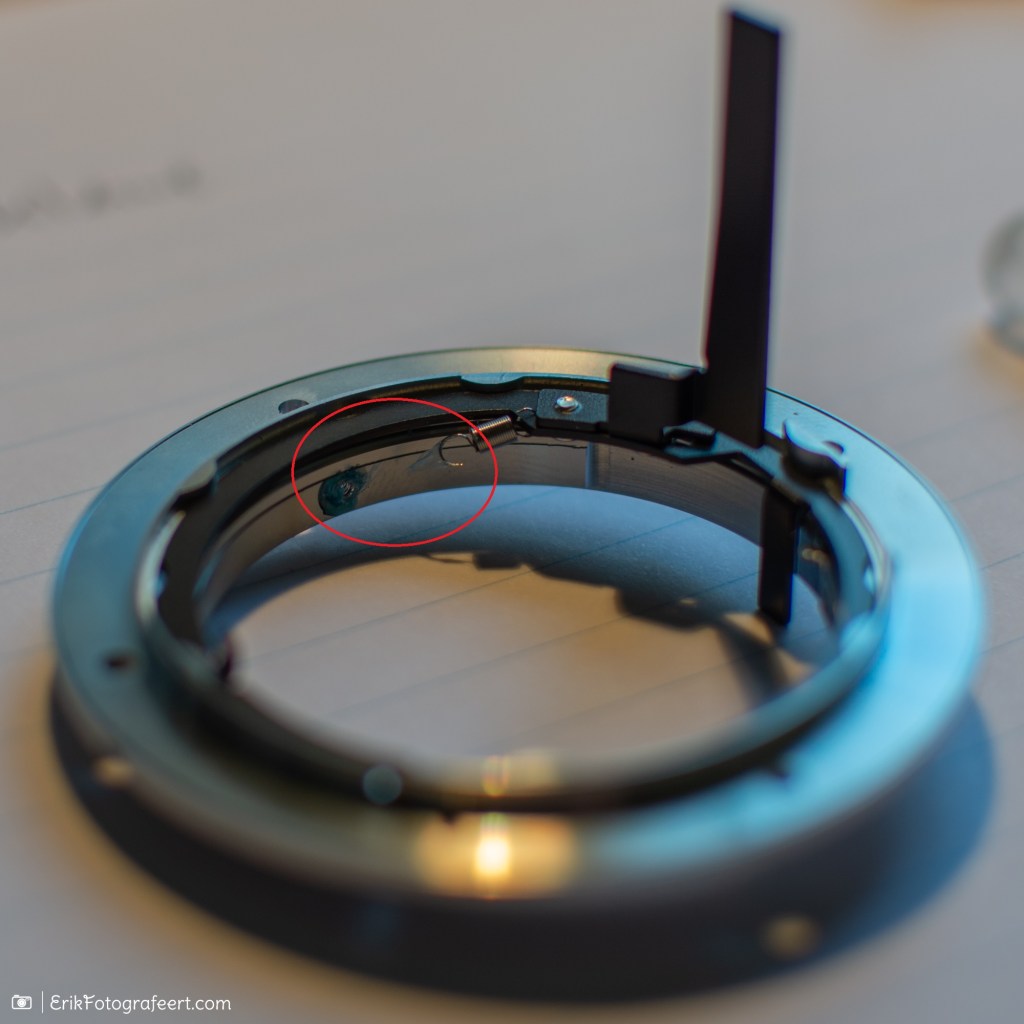 Dus vandaag de stoute schoenen aangetrokken en de lens opengeschroefd. Gelukkig zat het veermechanisme van het diafragma helemaal vooraan in de lens, zodat ik niet te diep hoefde te graven. En inderdaad, de diafragmaveer was losgeschoten! Zie in de foto rood omcirkeld. Ter controle de andere lens ook opengemaakt om te zien hoe het veertje vast moest zitten. Met een fijne pincet de veer een beetje in de juiste vorm gebogen en de rand schoongemaakt (daar zat een flinke blob van een soort hotglue op). Daarna het veertje juist vastgezet, geborgd met een drupje secondelijm en de lens weer in elkaar geschroefd.