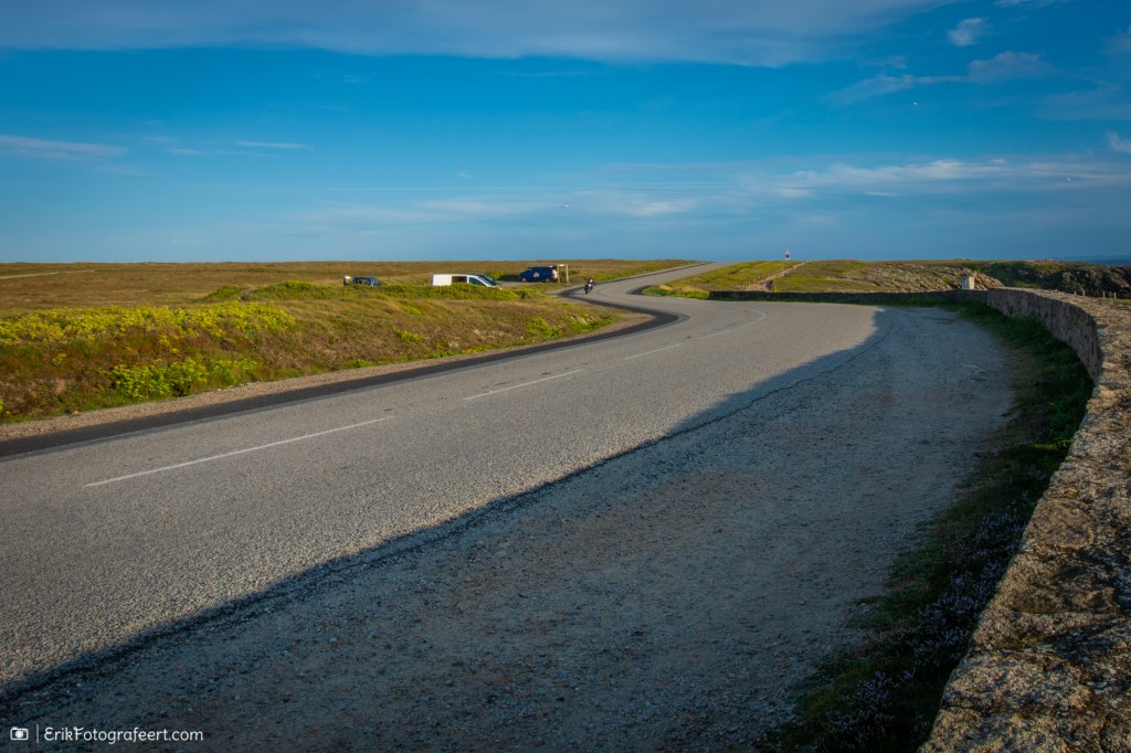 Deze foto is genomen op een kustweg op het schiereiland Quiberon in Normandië. De mooie slinger in de weg, de ene motorrijder en het mooie contrast tussen het blauw en het geelgroen van de planten spraken me aan. De weg neemt je mee naar de horizon, naar het onbekende… Overduidelijk is de weg hier het belangrijkst, vandaar de horizon op 2/3 van onder. F14, 17mm, ISO100, 1/80.