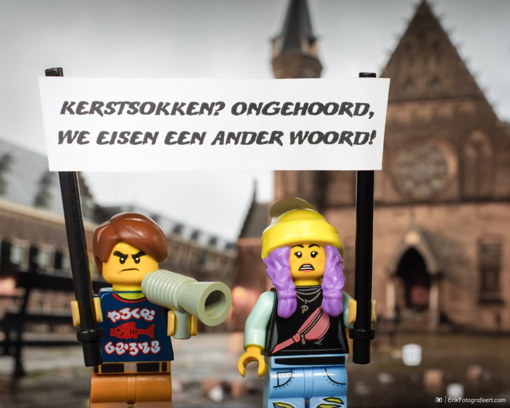 “LEGO matters” komt in Den Haag op voor de belangen van LEGO minifigs, zij hébben immers geen schoenen, sneeuwlaarzen en al helemaal geen kerstsokken!! Daarom deze massale demonstratie op het binnenhof. Met z’n tweeën dus, geheel volgens de nieuwe regels…
