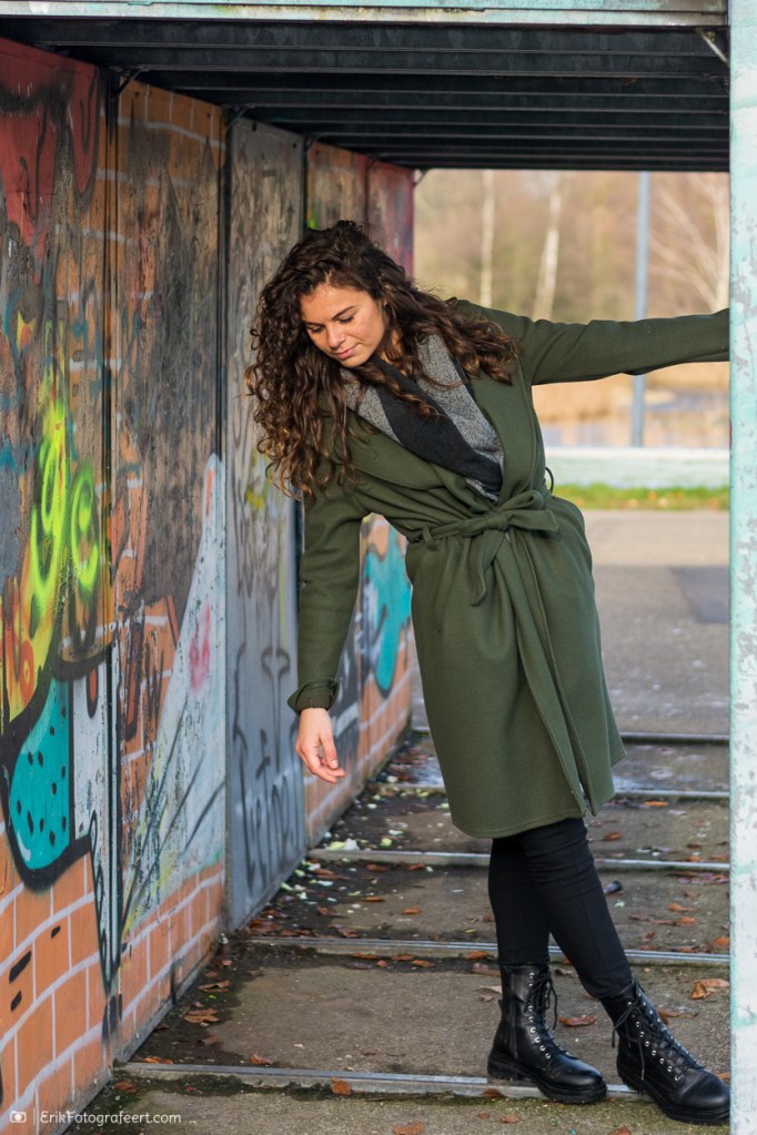 Voor deze shoot hadden we niet echt een thema afgesproken. Mijn doel was om gewoon op een relaxte manier een aantal dingen uit te proberen, gewoon kijken wat wél en wat niet werkt. En dat hebben we gedaan. We zijn daarbij ook de hele tijd aan de wandel geweest (ruim 6 km!) en hebben zo een stuk of 7 locaties geprobeerd, van een park tot een parkeergarage en een skate park tot een trappenhuis in een winkelcentrum. Ook dat was zoeken naar wat wel en niet werkt…