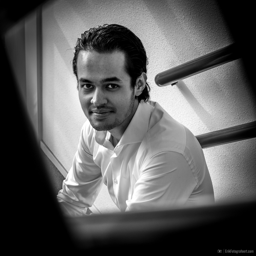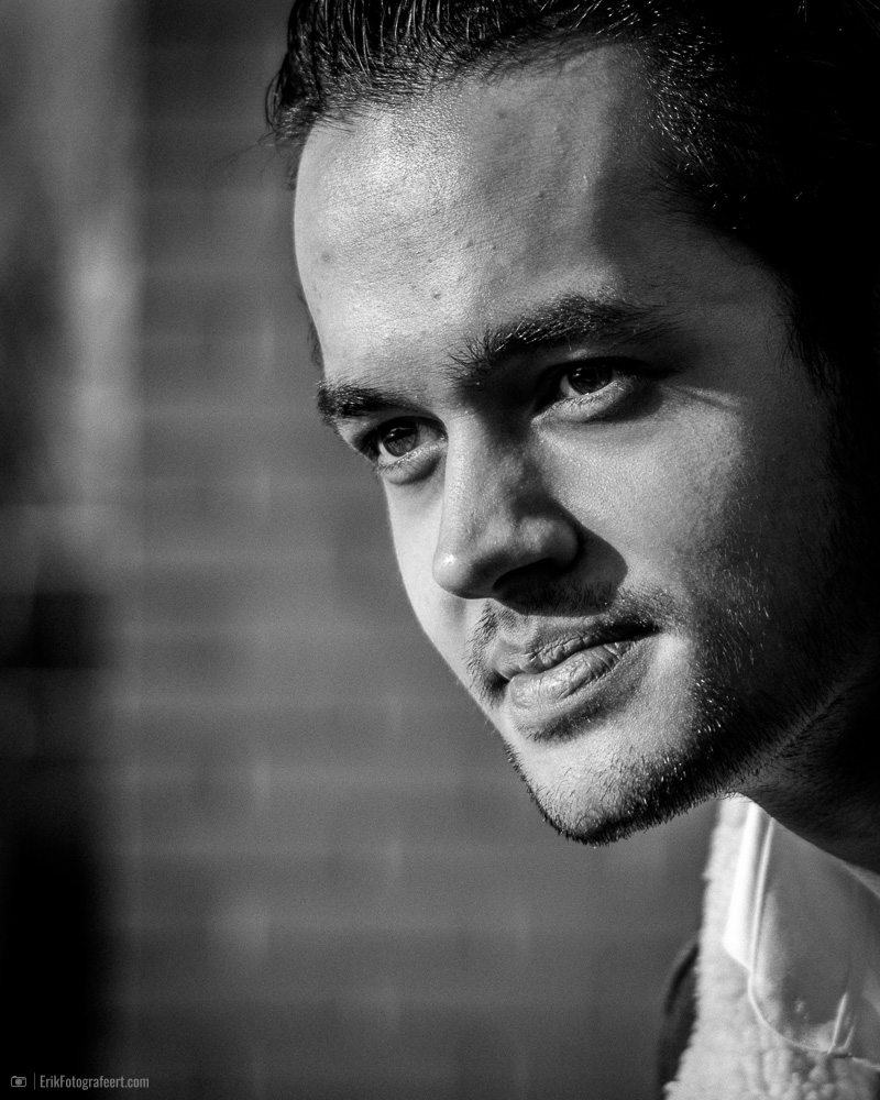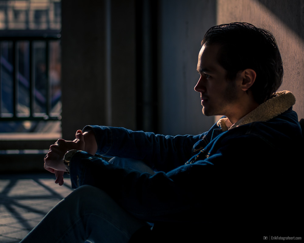 Erik vertelde mij dat hij nog niet veel ervaring had met portretten. Dat heb ik niet gemerkt! De voorbereiding hadden we beiden wat beter kunnen doen maar als je kijkt naar het resultaat.. waren we creatief genoeg met onze improvisatie. Wanneer je alle 2 enthousiast bent en je probeert wat in je op komt zorgt dat met Erik voor toffe platen. Voor mijn gevoel ging het heel natuurlijk. Ook het aansturen van poses deed hij prima. Ik snapte wat hij voor ogen had en probeerde de pose aan te nemen. Waar hij verbetering zag gaf hij dan aan.